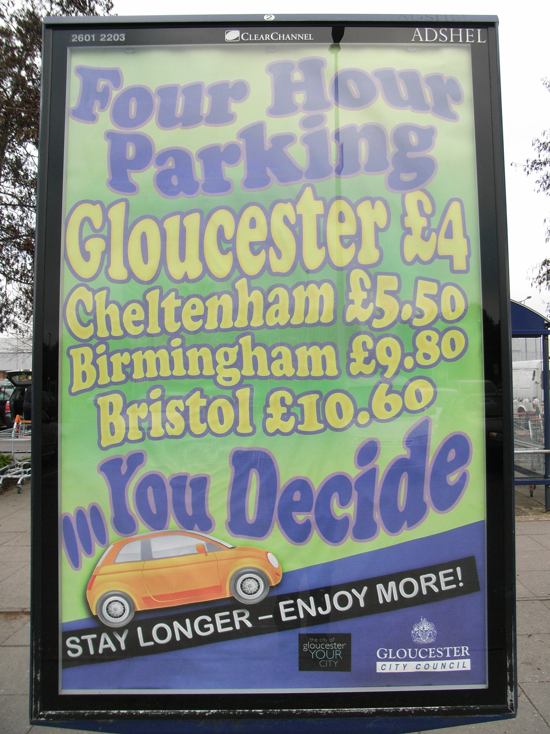 of an advert seen in the car park of Cheltenham Sainsbury`s shows, the price of parking for 4 hours in Gloucester is £4, whereas in Cheltenham it would cost you £5.50. So, without mentioning any other attractions in Gloucester, or indeed the new-fangled concept of Park-and-Ride, the marketing morons at the City Council think that people in Cheltenham will spend the extra money it takes to get to Gloucester and back to save £1.50 in parking charges.