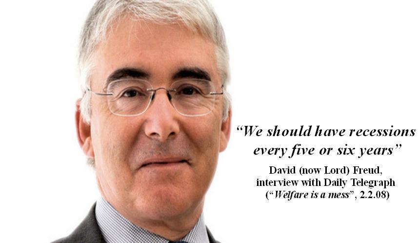 The involvement of ATOS in government welfare-to-work schemes started under the last Labour government, and one of the key politicians involved, former City financier David (now Lord) Freud has “served” both the Labour and Conservative parties during their respective periods in power. Some of his views given in interviews on private sector involvement in welfare-to-work schemes are very revealing. In February 2008, while he was “Welfare Reform” adviser to Prime Minister Gordon Brown, Freud told the Daily Telegraph he thought it was possible to get “about 1.4 million back to work”. By the time the final question of the interview came around he seemed to have forgotten the need to pretend he favoured an economy with lower unemployment, and when asked whether he thought there would be a recession, he replied “Yes, because we should have recessions every five or six years and we are due one”. http://www.telegraph.co.uk/news/politics/1577313/Welfare-is-a-mess-says-adviser-David-Freud.html This was one of the rare instances of a politician publicly departing from the mantra of claiming to want an economy that will produce “jobs and growth”. The following year it was clear the recession he`d told the Telegraph “we should have” had well and truly arrived. Freud joined the Conservative Party (where he received his peerage), shortly afterwards appearing on Radio Four`s Today programme (16 February 2009) where he said the following about the private companies bidding for contracts to help the long-term unemployed back to work: “there are fewer vacancies, there are more jobless, which could actually be good news for the private companies”.